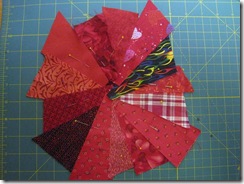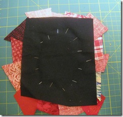 Jeg laget meg en mal som var like stor som den gamle firkanten jeg skulle dekke. Så målte jeg opp hvor store biter jeg trengte og klippet til disse og la dem på arket etterhvert. Det trykket som jeg hadde på tskjorten ville jeg klippe bort, for det var ganske stivt, derfor sydde jeg de røde biten på et svart bomullstoff, mens jeg kontrollerte med papirmalen min at det gamle trykket ble dekket.