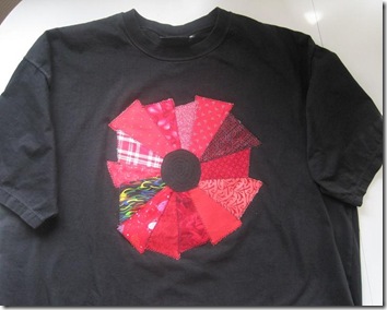 Da alle sømmene fra midten og ut var sydd tok jeg og satt på vliesofix på endene så jeg kunne stryke det hele fast på tskjorten. Så ble hele blomsten sydd fast ytterst og jeg kunne klippe bort trykket fra innsiden.